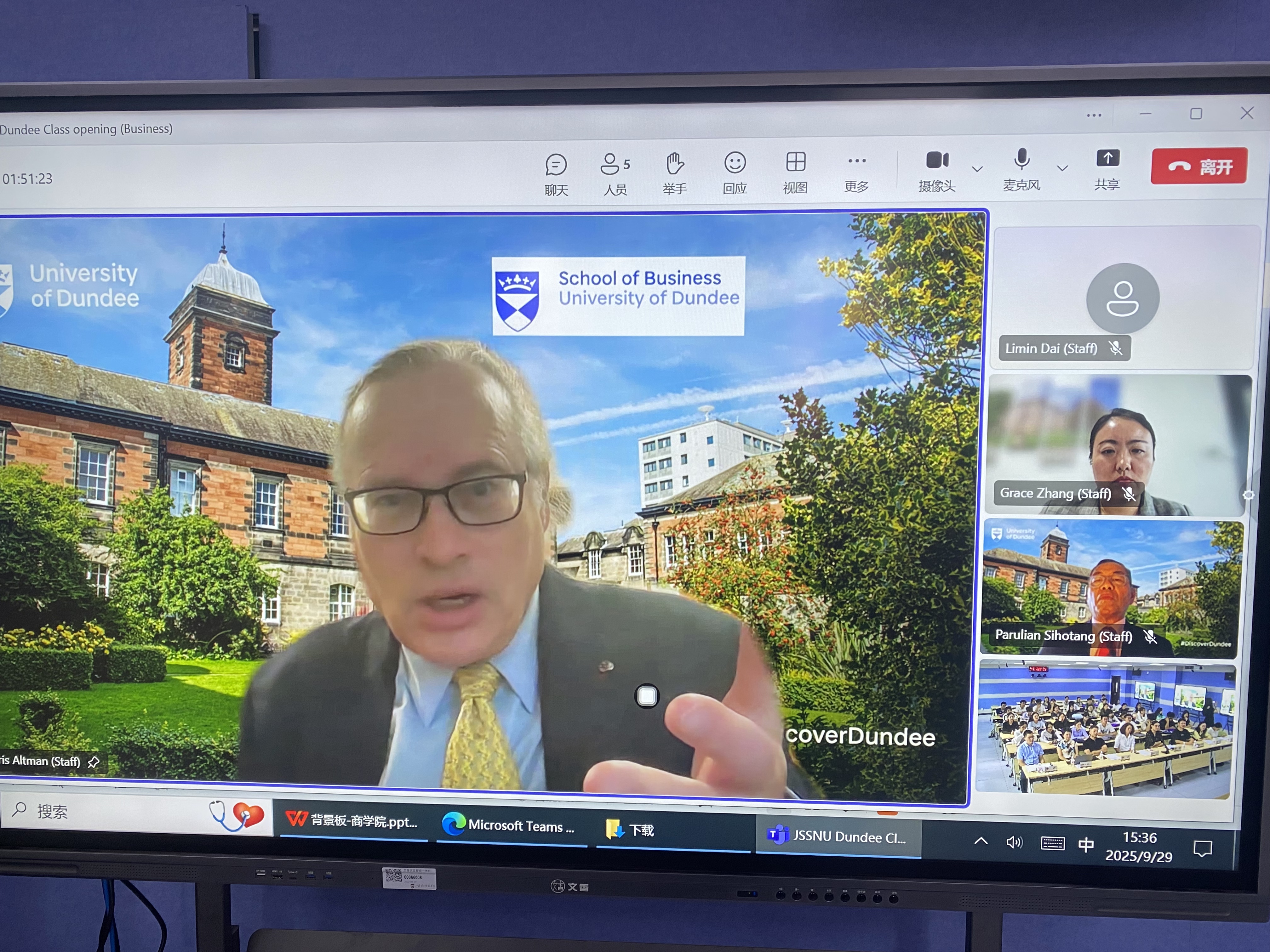 参加开学典礼的人员主要有:邓迪大学商学院院长Morris Altman教授、副院长Parulian Sihotang博士、大中华区主任Judy Finlay、中国办公室合作主管Grace Zhang、中国办公室合作经理Limin Dai、南京青梦家副总经理马路、总经理助理薛希、我校商学院党总支书记张淼、党总支副书记辛宪军、中外班班主任高源、辅导员张尧、以及2025级中外班的全体新生。开学典礼由商学院副院长吴晋主持。开学典礼采用线上线下、中英互动相结合的方式举行,跨越时空共同见证这一重要时刻。