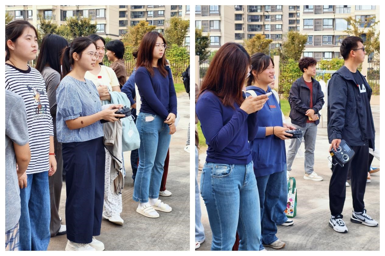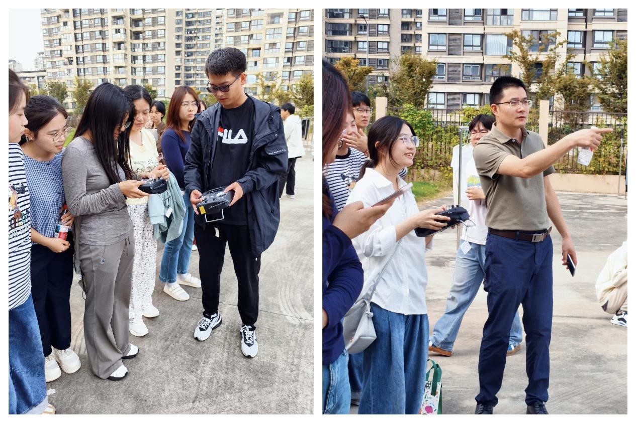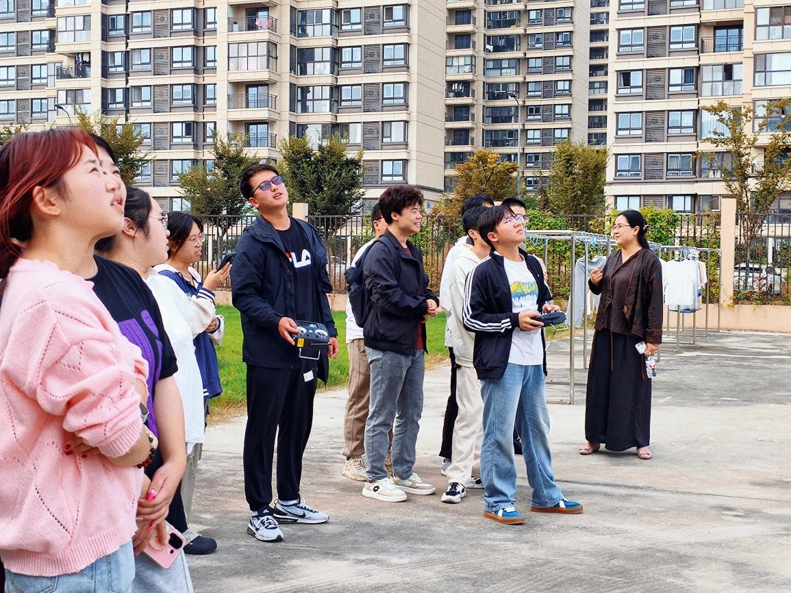 课程最引人入胜的环节当属户外飞行实操。在教员“手把手”的耐心指导下,学生们分组进行了人生中第一次无人机飞行体验。从启动、悬停到平稳降落,每一次成功的操控都引来阵阵欢呼,兴奋之情洋溢在每位同学的脸上。