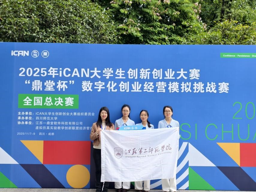 11月7日至9日,2025iCAN大学生创新创业大赛“鼎堂杯”数字化创业经营模拟大赛全国总决赛在四川省成都市举办。江苏第二师范学院商学院朱高婕、季佳怡、潘睿馨组成的“经营特工”队,在青年教师张玥的带领下,历经校赛、区域赛、全国初赛及总决赛的多轮角逐,最终斩获全国一等奖,张玥老师获“优秀指导老师”称号;在先期举行的江苏省选拔赛中,另有一支队伍获得二等奖,四支队伍获得优胜奖。这是我校近年在此项赛事中取得的最好成绩,为学校创新创业教育再添亮色。