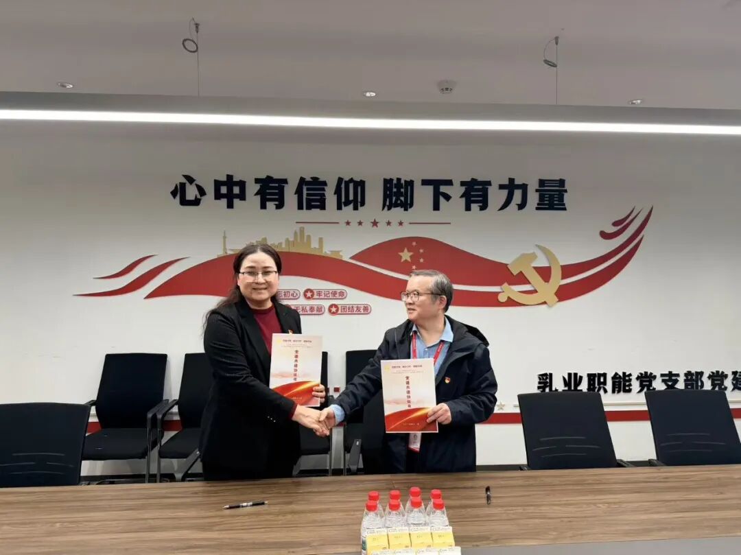 在产品体验环节,大家现场品尝了卫岗的新品乳制品,对其口感与品质给予了一致好评。南京卫岗乳业有限公司总经理、党委书记孙齐红与我校师生就党建资源共享、学生实习实践等核心议题进行了深入交流,双方一致认为应以党建为纽带,共同构建“理论+实践”的人才培养平台,并现场签订了校企党建共建协议与实践基地协议,举行了授牌仪式,为未来深化合作奠定了坚实的基础。