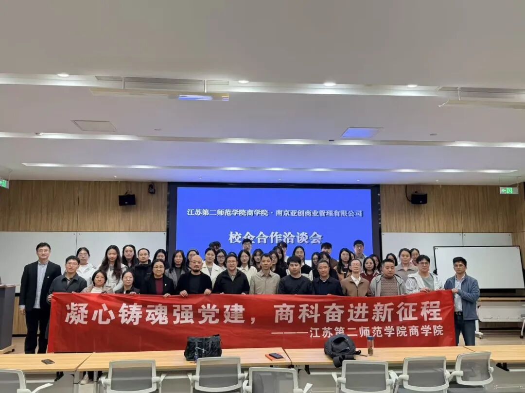 活动的最后一站,师生们参观了南京亚创商业管理有限公司。总经理谭宁首先介绍了企业的核心业务,重点分享了亚创在资产管理领域的探索,并指出企业与商科专业在多个领域存在合作空间,为校企合作提供了广阔的思路。张淼书记提醒师生要以党员的严谨态度“认真听、主动问”,从企业的创新实践中汲取实战经验、对标岗位标准,同时围绕学院党建工作的核心思路,简要介绍了学校应用型办学定位与商学院专业特色,突出了党建引领下的人才培养优势,为深化校企党建共建与定岗合作奠定了基础。