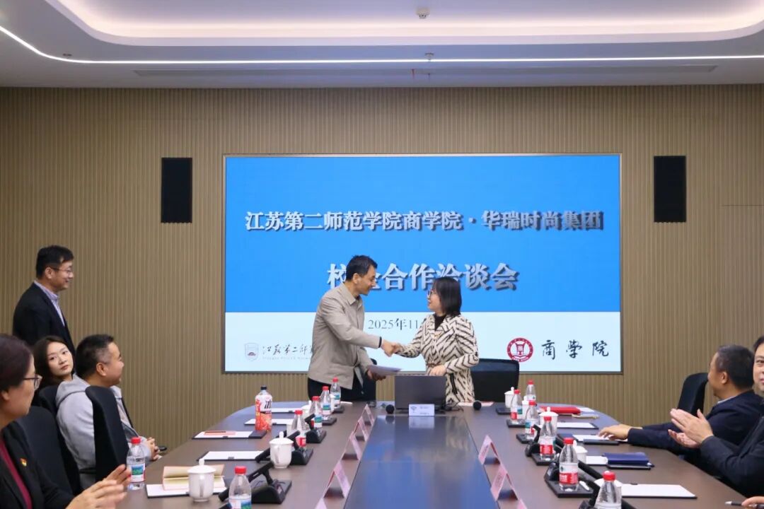 离开卫岗乳业后,师生一行前往华瑞时尚集团。集团人事部总经理顾海燕以“六次转型”为重点,介绍了企业自1994年工贸一体化转型以来的发展历程,包括实施“走出去”战略、布局内贸、品牌升级,以及在海外设立公司、2023年打造特色产业园等,展现了企业的创新活力与前瞻性视野。商学院党总支书记张淼表示,此次以党建为引领的企业访问,是学院将党建工作与人才培养紧密结合的生动实践。组织师生深入企业一线,不仅使大家走出课堂,直观感受市场经济的运行规律与行业发展的脉搏,更在党建搭建的沟通桥梁中,通过与企业的近距离对话,拓展了专业视野、明确了学习与就业的方向,对于锚定党建育人目标、提升人才培养的针对性、促进学生的高质量发展具有重要意义。院长孙爱军对华瑞企业转型的远见表示赞赏,并提出通过专场招聘会深化合作。从交流中可以感受到企业对我校人才的认可与期待,相信未来将有更多毕业生获得企业的就业机会。