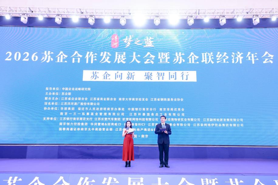1月18日下午,由苏企联主办,江苏省企业联合会、江苏省商业联合会、南京大学南京校友会、江苏省钢铁服务业协会联合主办的“2026苏企合作发展大会暨苏企联经济年会”在宁召开。来自智能制造、物联网、工程建设、新消费等各个行业的企业家代表近1000人参加了本次活动。江苏省原副省长李全林,江苏省原副省长张九汉,江苏省政府办公厅原副主任、一级巡视员吴剑铭,南京大学原党委副书记兼纪委书记任利剑,江苏省工商联副主席郭东升,中国企业联合会副会长潘宪生,江苏省企业联合会会长李琨,江苏省商业联合会会长王续刚,北京零点有数股份有限公司董事长袁岳,江苏省物流产业促进会会长周晓林,南京海昌中药集团董事长蔡宝昌等出席活动。